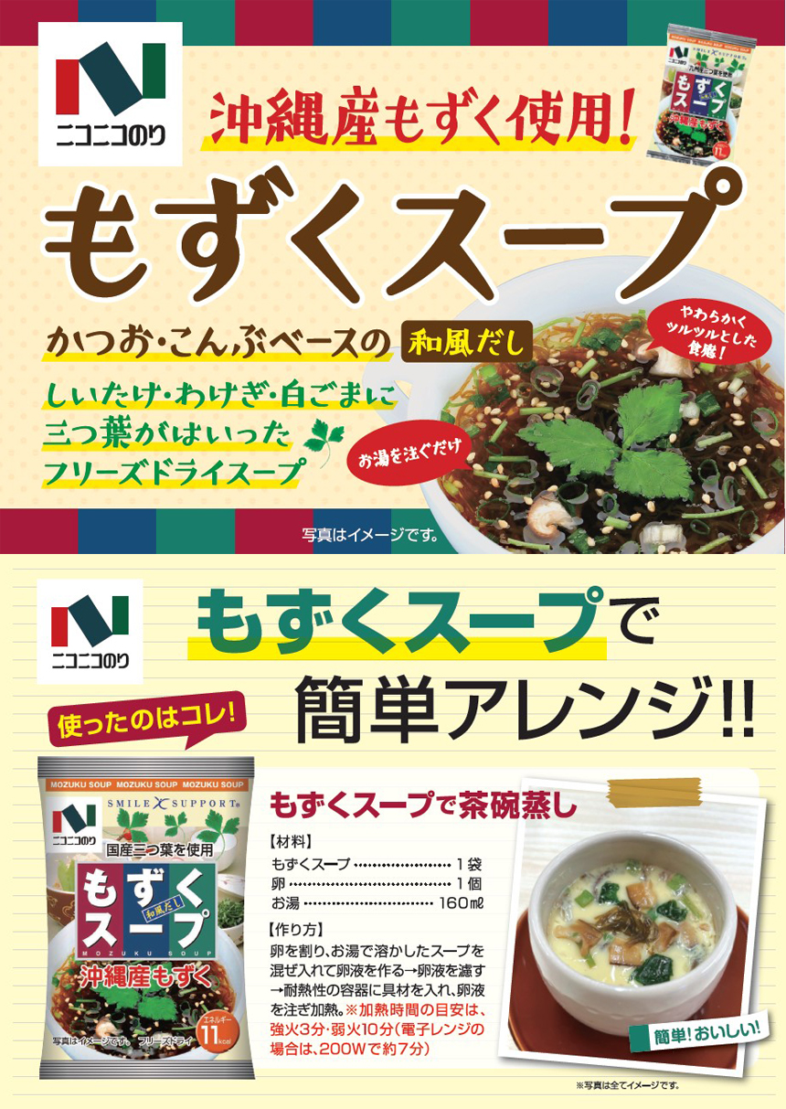 沖縄産のやわらかい上質なもずくを使用していますので、ツルツルした食感をお楽しみいただけます。