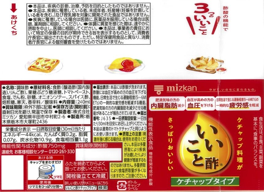 毎日の食生活は変えずに、さっぱりおいしく3つの健康対策ができる、ケチャップと同様に使える機能性表示食品の調味酢です。