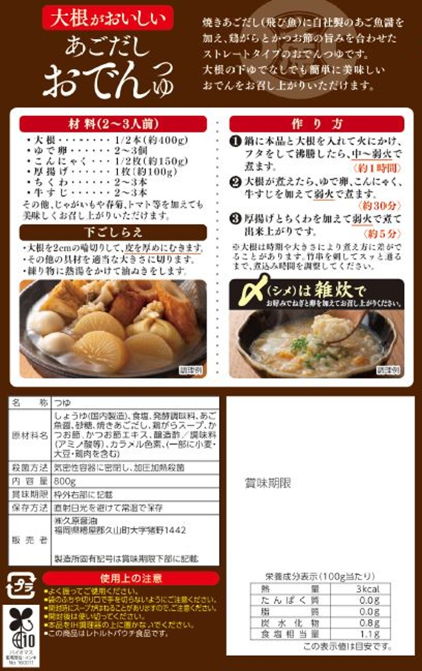 焼きあごだし(飛び魚)に自社製のあご魚醤を加え、鶏ガラとかつお節の旨みを合わせたストレートタイプのおでんつゆです。