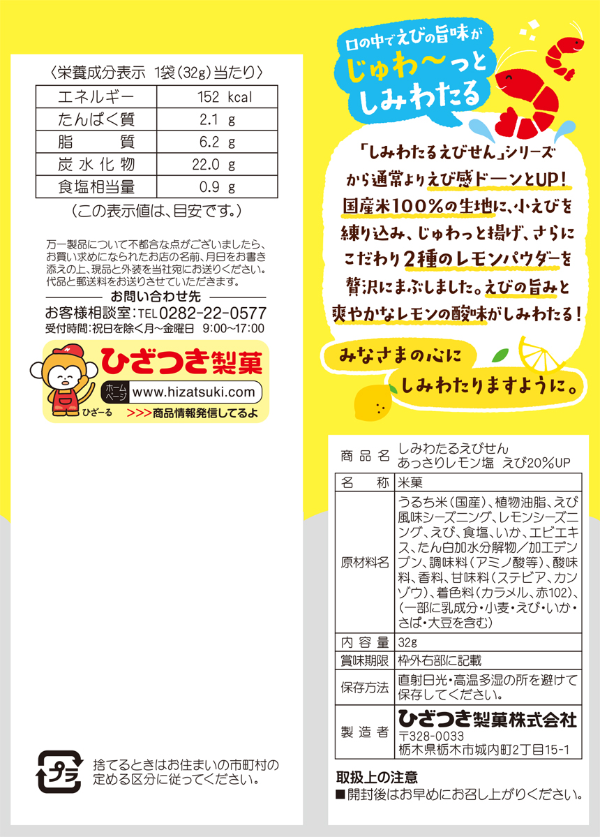 国産米100%の生地に、小えびを練り込み、じゅわっと揚げ、さらにこだわり2種のレモンパウダーを贅沢にまぶしました。