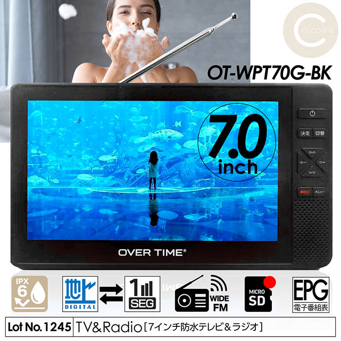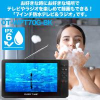 ポータブルテレビ 7インチ 防水 フルセグテレビ FMワイドラジオ 充電式 バッテリー内蔵 AM局もFMで聞けるフルセグ 地デジ録画機能 OT-WPT70G-BK
