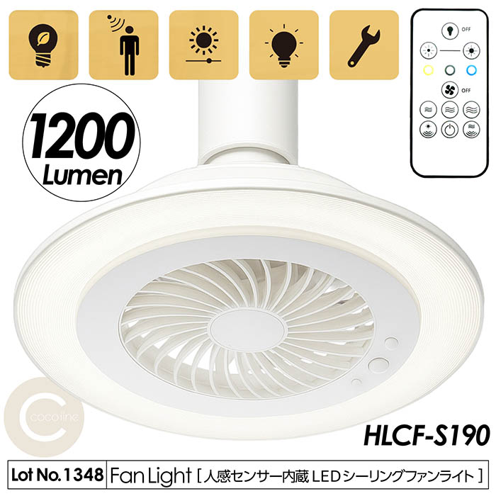 シーリングファン 人感センサー内蔵 LED シーリングファンライト 60秒間自動点灯 工事不要 E26ソケット HLCF-S190