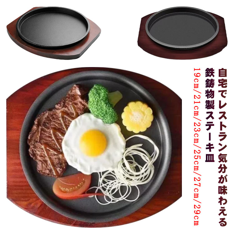 | 自宅でレストラン気分が味わえる鉄鋳物製ステーキ皿。 アツアツのステーキが卓上で楽しめる木製のプレート付! ステーキだけではなく、ハンバーグやパスタ、焼きそばなどにもお使いいただけます。 ガス火はもちろん、IHクッキングヒーターやオーブンも対応!食器洗い乾燥機使用不可! | |