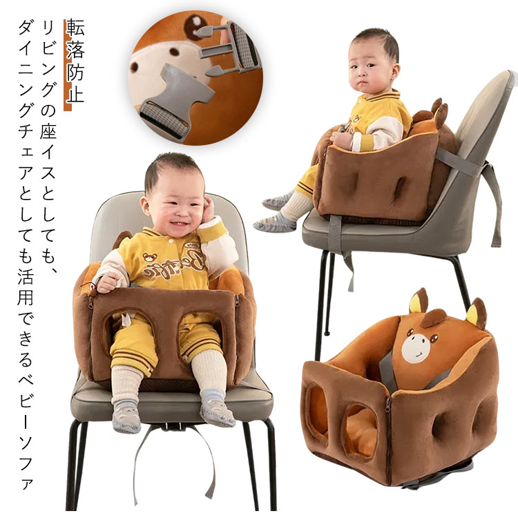 | リビングの座イスとしても、ダイニングチェアとしても活用できるベビーソファ。 リビングでのお食事や、お座りして遊びたいときにも便利。 大人のダイニングチェアの上に置いて、ベルトで固定するだけ。家族みんなでダイニングテーブルを囲むことができます。 座面が広く、椅子としても安定感抜群。クッションは弾力性が高く、へたりにくい。 360度優しく包みこんで赤ちゃんのお座りをサポートしてくれて、ベビーの姿勢を支えてくれます。 揺らしても倒れにくい、安定感があるユニークなベビーチェア。 | |