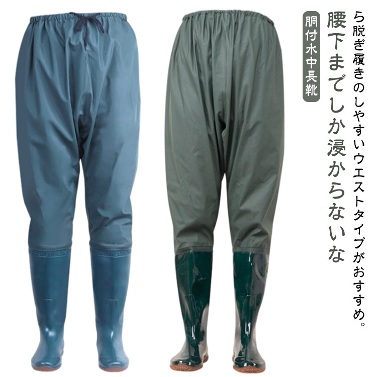 | 腰下までしか浸からないなら脱ぎ履きのしやすいウエストタイプがおすすめ。胴付水中長靴 普通のウェーダーよりも着脱しやすく、ヒップウエダーよりも扱いやすいです。 かさ張りにくく、柔らかなPVC素材を使用しているので、長靴感覚で気軽に使えてちょっとした作業等に重宝します。 ウエストゴムと調節可能な紐付きでウエストにフィット。 ソールはグリップのいい深溝のラジアル底で、船上でも使え、スパイクとは違って音も少なく、床を傷つける事もありません。 多用途!渓流釣り、農作業、漁業、水産業、除雪作業、冠水時の対応、アウトドア活動など様々なシーンで活躍。 | |