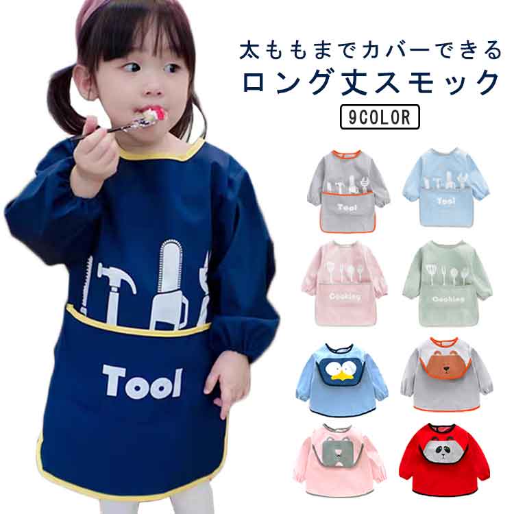 | 太ももまでカバーできるロング丈スモック ほかにはめったいに見えないロング丈、お食事の時、太もももカバーしてくれて、食べこぼしによるパンツの汚れ心配もなし◎ さらに、ポケットつきで、食べこぼしをキャッチするから、自由に食べさせるのも安心◎ 表は撥水加工で汚れてもサッと一拭きで取れるから、いつでも清潔で◎ 袖付きなので、汚しやすい袖部分を手首までカバーしてくれるから、保育園や幼稚園で大活躍◎ | |