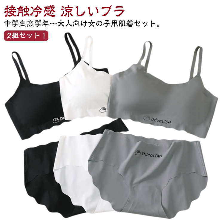 | 2組セット!中学生高学年〜大人向け女の子用肌着セット。 スポーツブラとパンツの上下2点セットです。。 生地は吸汗速乾性素材を使用しているので、さらっとした肌あたりです 肩に負担がかかりにくいストラップは安定感のある幅広タイプ。 伸縮性のあるノンストレスな着心地。体にピッタリフィットして揺れないのでダンス衣装のインナーとしても大活躍! シンプルなデザインのハーフトップ、ジュニア向けインナー。 ? | |
