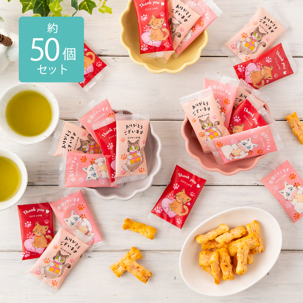 お菓子 お礼 ありがと おかき 約 50個 猫 ネコ 感謝 ありがとう 個包装 三州製菓 お返し 退職 異動 転勤 謝恩会 プチギフト ホワイトデー