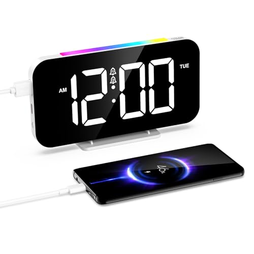 デジタルLED時計 10色RGBダイナミックライト 調節可能な明るさ USB&Type-C充電ポート 大画面 2つアラーム機能 大音量 ベッドサイド 寝室用 ヘビー