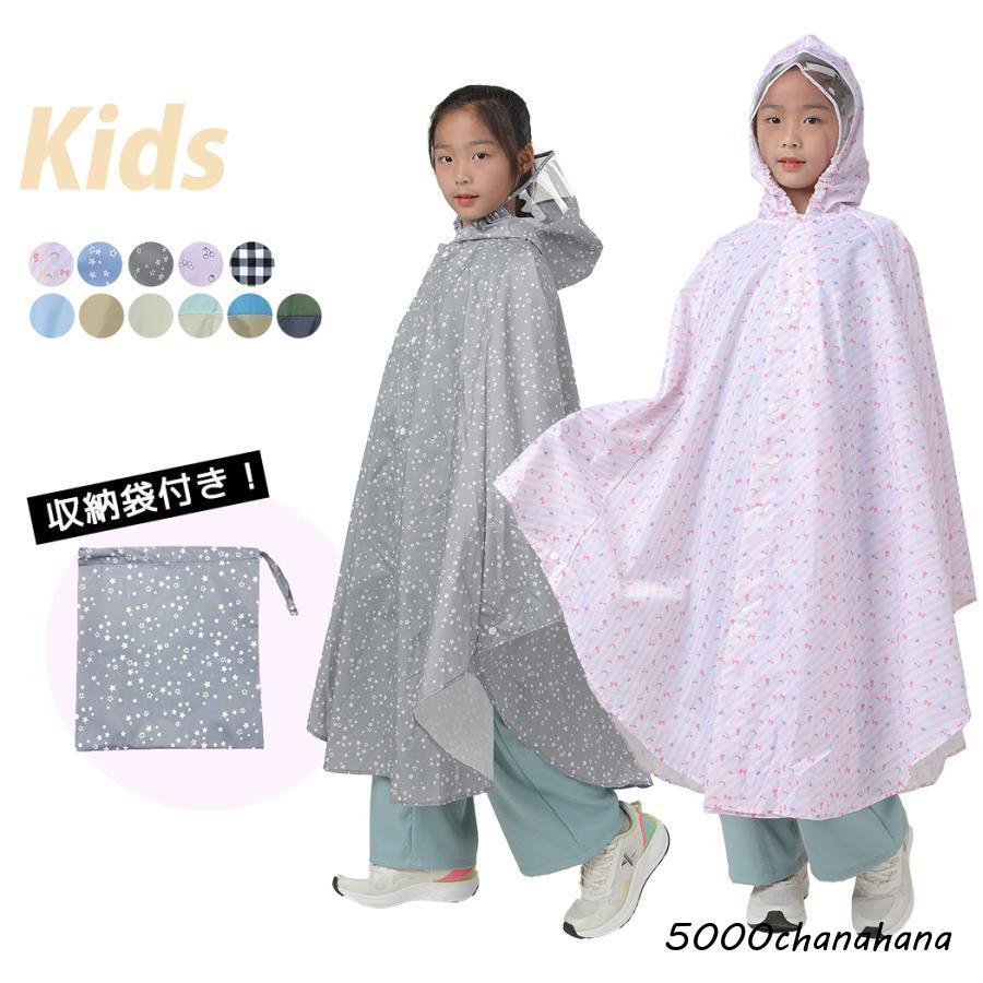 キッズ レインポンチョ レインコート 男の子 女の子 小学生 ジュニア 収納袋付き 2点セット リュック対応 ランドセル対応 カッパ 合羽 撥水 フード付き ボタン 反射テープ クリアバイザー 総柄 ギンガムチェック 星 フルーツ柄 リボン柄
