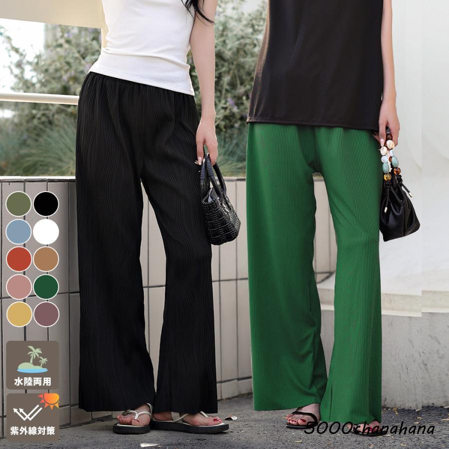 ラッシュガード パンツ レディース 水陸両用 水着 体型カバー おしゃれ かわいい 春夏 秋 UVカット率 99%以上 UPF50+ ゆったり 薄手 ストレッチ 黒 白 ワイドパンツ とろみ 2タイプ ストレートリブ カーブリブ ウエスト ヒップ 太もも 脚 カバーアップ ウエストゴム UV対策
