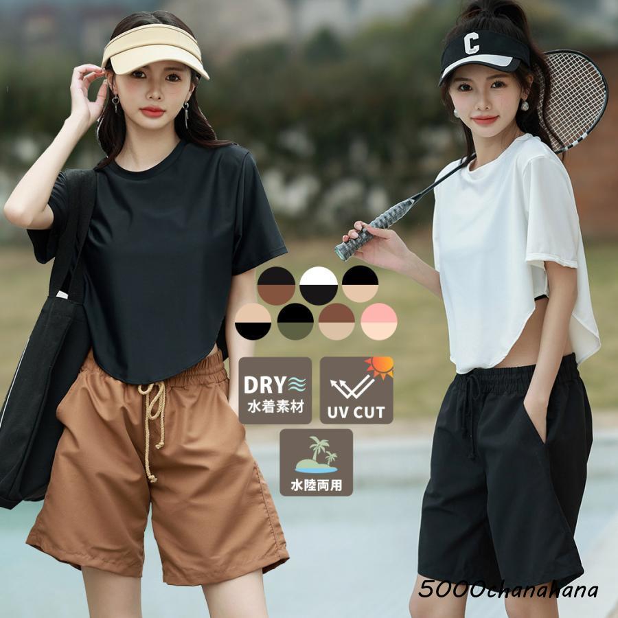 ラッシュガード レディース 上下 2点セット トップス ハーフパンツ 水陸両用 おしゃれ 体型カバー 薄手 Tシャツ 春夏 黒 白