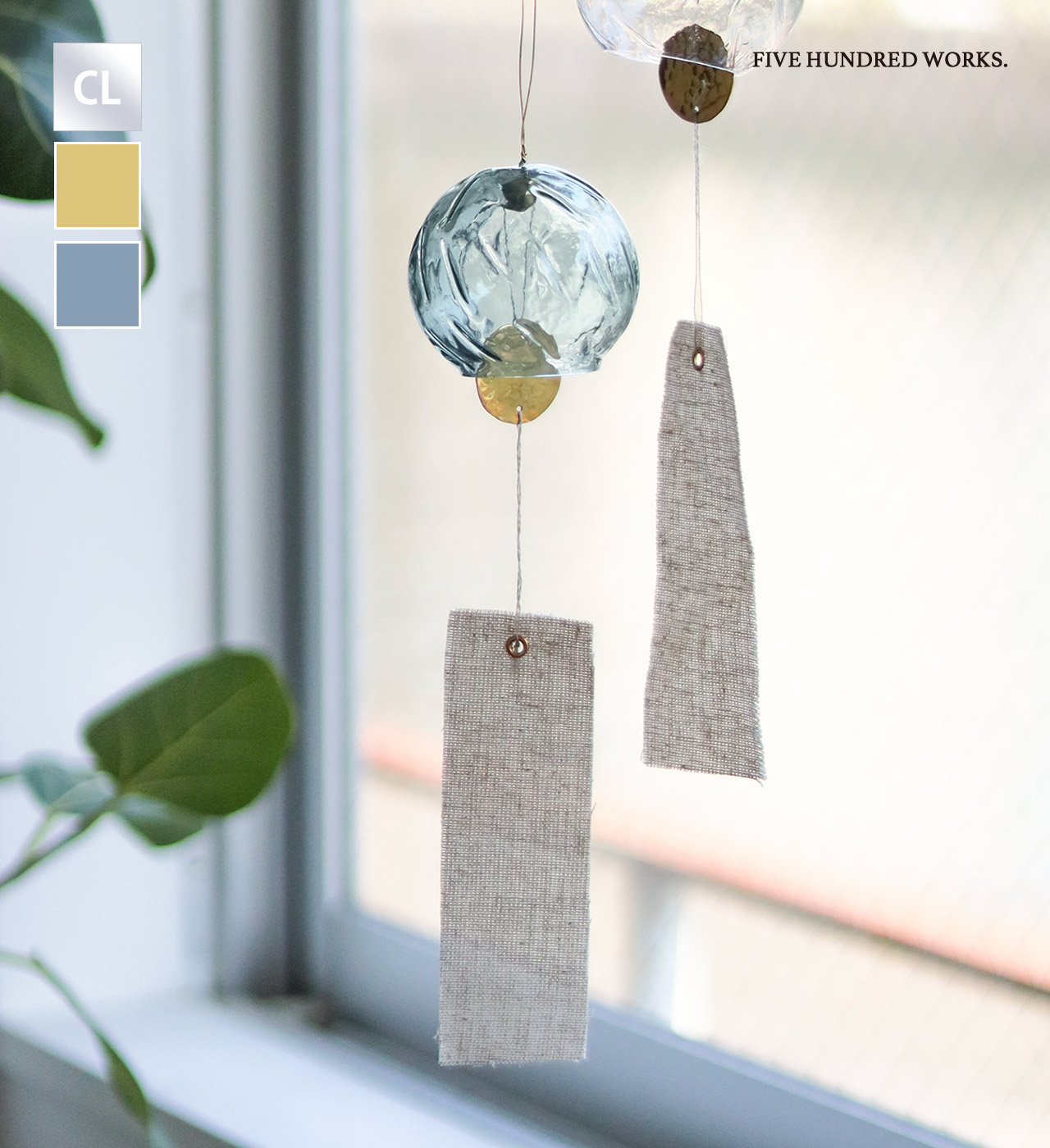 夏にぴったりの涼し気な3カラー。内側のパーツには槌目(つちめ)加工を施した真鍮を使用しています。コットンリネン製の短冊は、あえて端の縫製処理をしないことで素材の持つ清涼感を大切にしました。ガラス部分に真鍮のパーツが当たることで、澄んだ綺麗な音色が響きます。