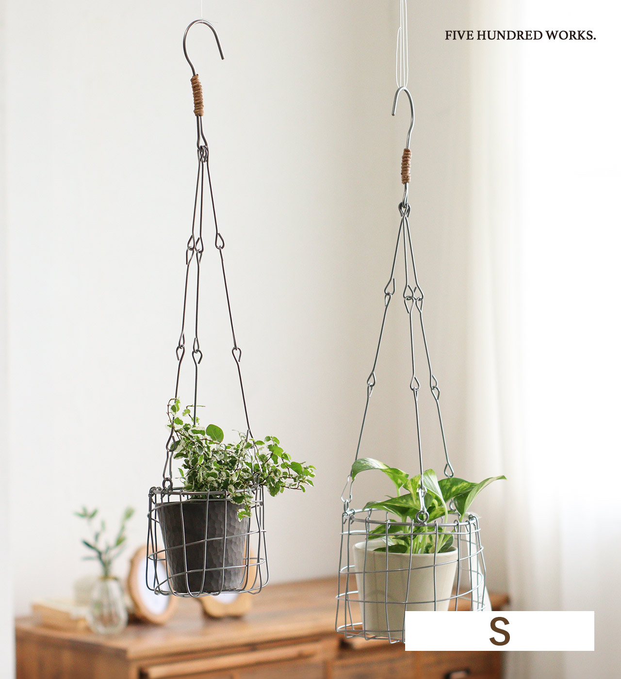 ワイヤーを使ってハンドメイドで編まれたハンギングポットカバー。落ち着いたシルバー塗装で仕上げ、アクセントに柳を使ったハンギングポットカバーです。お気に入りの鉢をそのまま入れてフックなどで吊るすだけで ハンギンググリーンをお楽しみいただけます。ナチュラル過ぎないシルバーカラーがお部屋のインテリアのアクセントに。サイズ違いで並べて飾ったり、その他のDusaule(デュソール)シリーズで収納を揃えてもインテリアに統一感が出ておすすめです。
