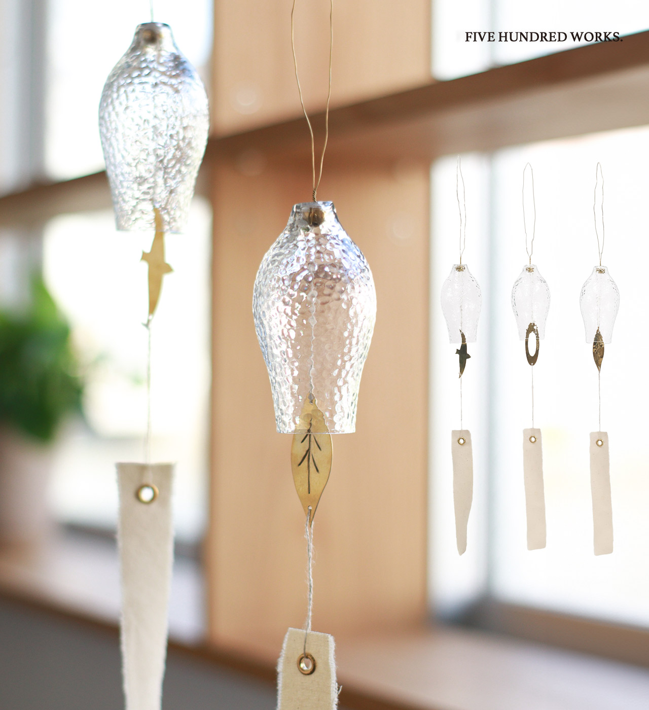 ガラスと真鍮を組み合わせた、涼しげで圧迫感のない佇まいの風鈴。細身ですっきりとしたデザインに、凹凸のあるガラス表面が光をやわらかく反射し、空間にさりげない表情を添えます。短冊にはコットンリネン素材を使用し、あえて端の縫製処理を施さないことで、素材本来の清涼感を大切にしました。中に取り付けられた真鍮製のおもり(舌・ぜつ)は、バード・リング・リーフの3種類。それぞれ異なるデザインで、ガラス部分に真鍮のパーツが当たることで、澄んだ美しい音色が心地よく響きます。見た目にも音にも涼を感じられる、夏の暮らしにそっと寄り添う風鈴です。