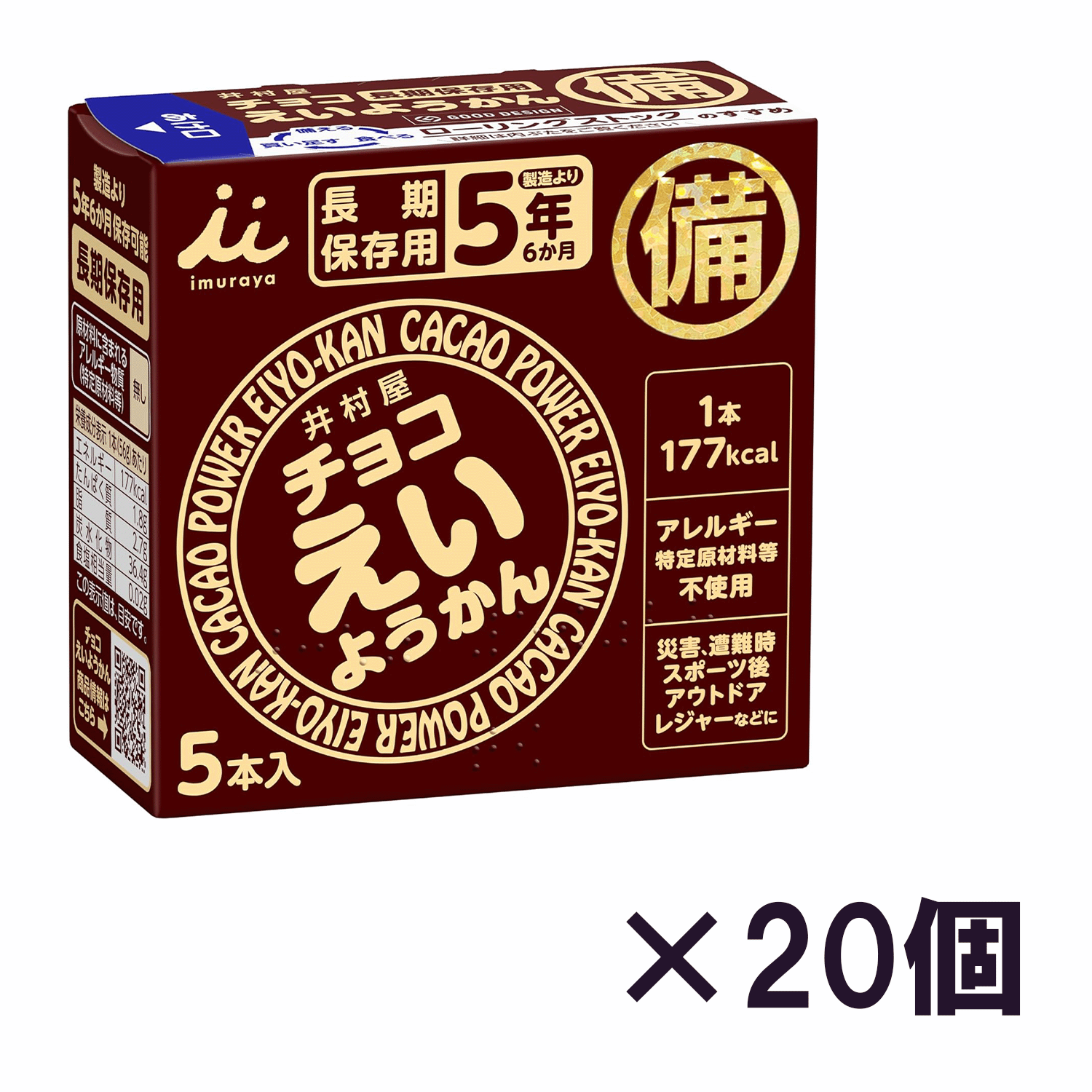 備えて安心、手軽にカロリー補給可能な長期保存型 食べ切りサイズのミニチョコようかんです。濃厚なチョコレートの風味を楽しめ、万が一の災害・避難時に手軽にカロリーを補給できます。アレルギー特定原材料等不使用。水がなくてもおいしく食べられます。備蓄・保存用に最適な5年間保存が可能なロングライフ商品で、備蓄スペースを考慮した省スペース設計です。ユニバーサルデザイン。普段から食べ慣れているものは災害時に安心して食べることができ、「備える」→「食べる」→「買い足す」のサイクルを回すローリングストックは賞味期限切れも防ぐことができるのでおススメです。パッケージには点字やホログラム、災害用伝言ダイヤル171の利用方法を記載しています。備蓄用の他、スポーツ・アウトドア・レジャー時のエネルギー補給にも便利です。
