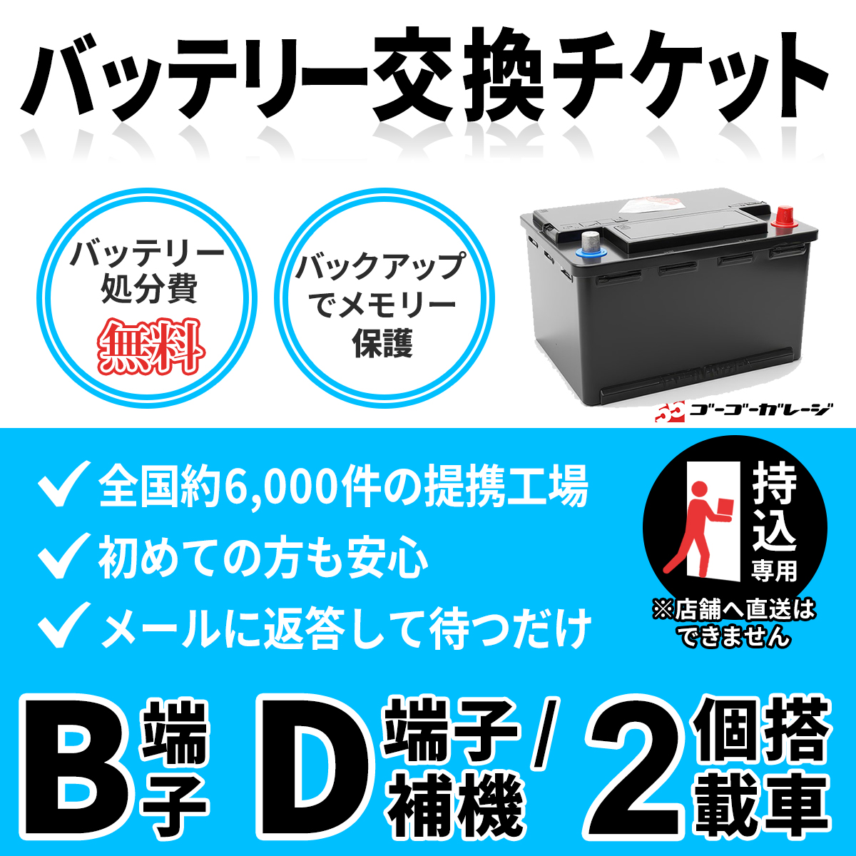 1.バッテリーはお客様にて取付店へお持ち込みください。