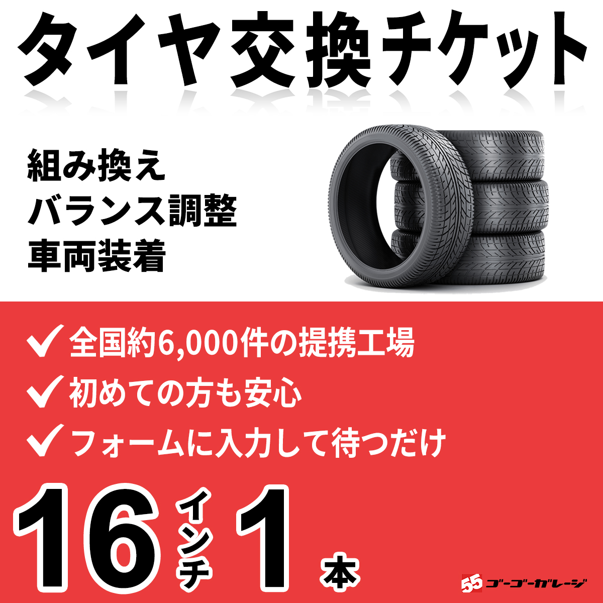 タイヤ交換16インチ 1本 組み換え、バランス調整、取付 ゴーゴーガレージ 全国約6000店舗網 タイヤ交換チケット