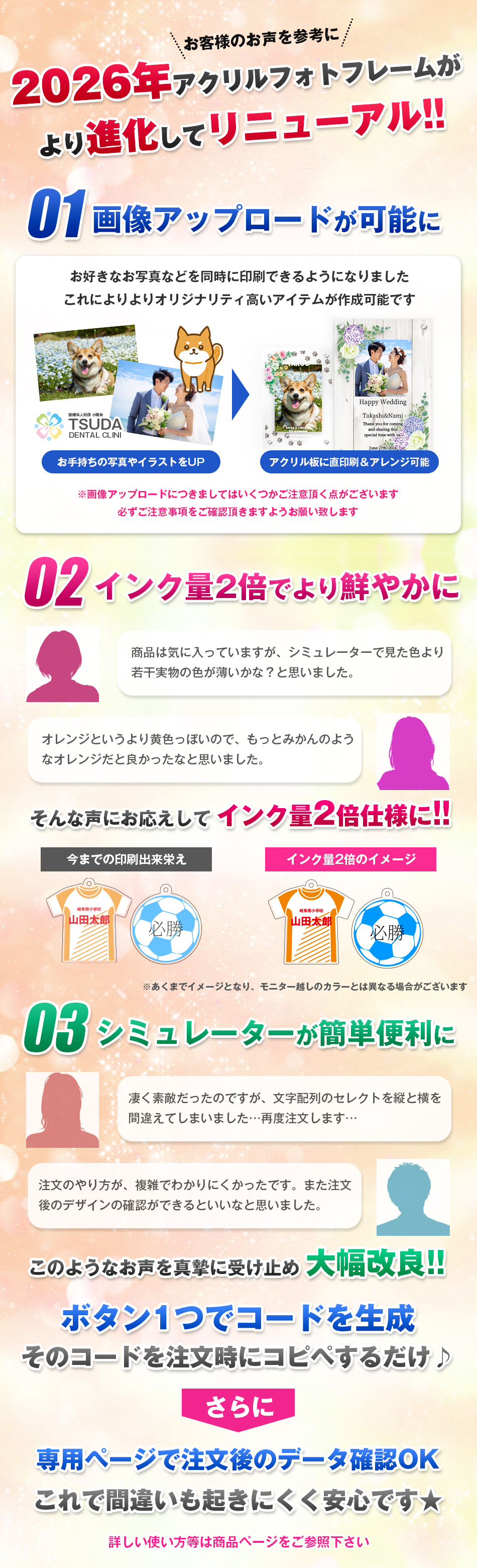 フォトフレームとしてはもちろん、デザインを豊富に用意、文字入れも自由度が高いので、さまざまな用途用にお作り頂けます。