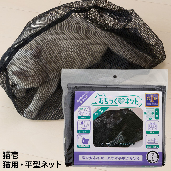 猫壱の「おちつくネット」は二重メッシュで丈夫。大きさも約55cm×65cmのゆったりサイズになっているので大きめ猫ちゃんにも対応可能です。