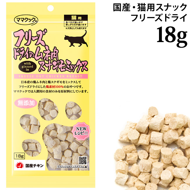 ママクック フリーズドライのムネ肉スナギモミックス 18g 猫用おやつ 国産チキン使用 無添加「ママクック フリーズドライのムネ肉スナギモミックス」は、新鮮な国内産鶏のムネ肉とその良質な砂肝をミックスしてフリーズドライにした猫用おやつです。