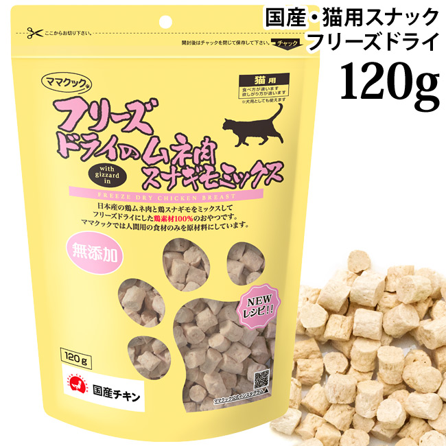 ママクック フリーズドライのムネ肉スナギモミックス 120g 猫用おやつ 国産チキン使用 無添加「ママクック フリーズドライのムネ肉スナギモミックス」は、新鮮な国内産鶏のムネ肉とその良質な砂肝をミックスしてフリーズドライにした猫用おやつです。