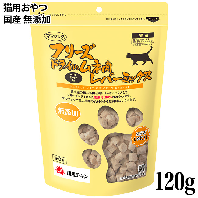 ママクック フリーズドライのムネ肉レバーミックス 120g新鮮な国内産鶏のムネ肉とその良質なレバーをミックスしてフリーズドライにした猫用おやつ。