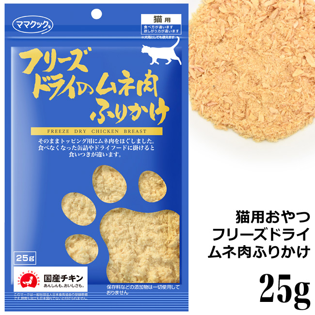 生の国産鶏ムネ肉をそのままフリーズドライにし、トッピング用にほぐしたふりかけタイプです。