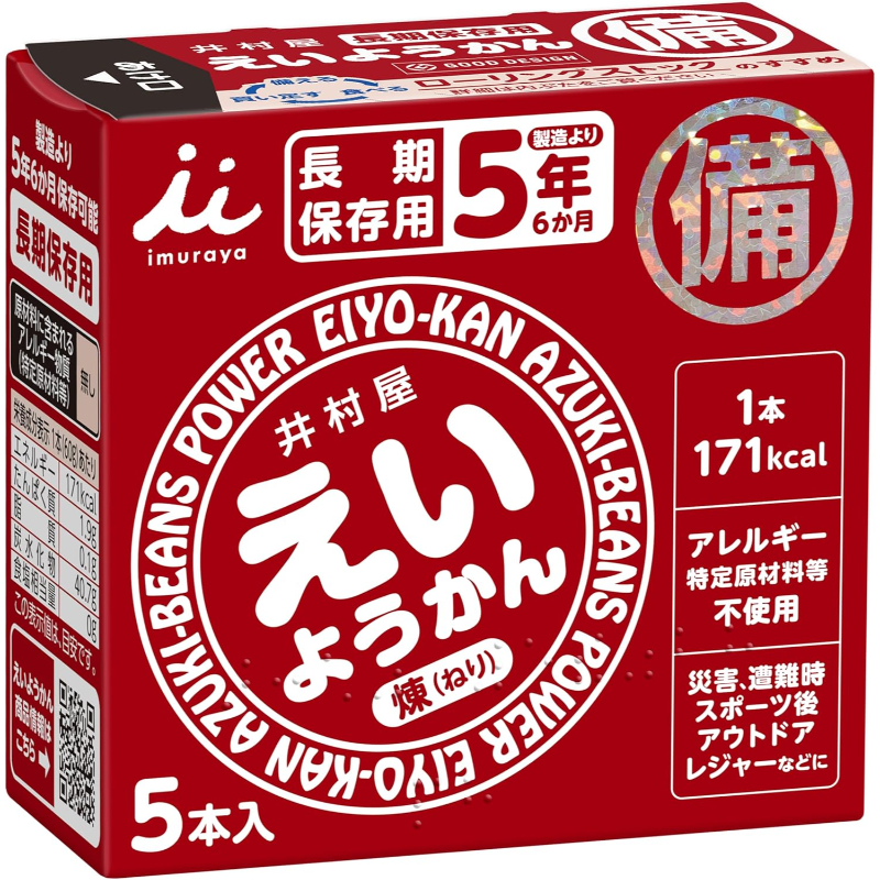 商品詳細 長期保存可能(賞味期限設定5年)で手軽にカロリー補給が出来ます。(一本でご飯一杯分)万が一の災害時・避難時に適した備蓄・保存用ようかんです。アレルギー物質(特定原材料等)を含む原料不使用で多くの方に配布する会社や公共施設の備蓄に適しています。 災害時などハサミがない時でも手で簡単に開けて食べられます。 原材料:砂糖(国内製造)生あん(小豆)水あめ寒天 栄養成分 1本(60g)当たり/エネルギー171kcal ・暗闇で見つけやすいホログラム付き ・パッケージに点字付き ・災害用伝言ダイヤル案内 ・防災袋に入れやすいサイズ