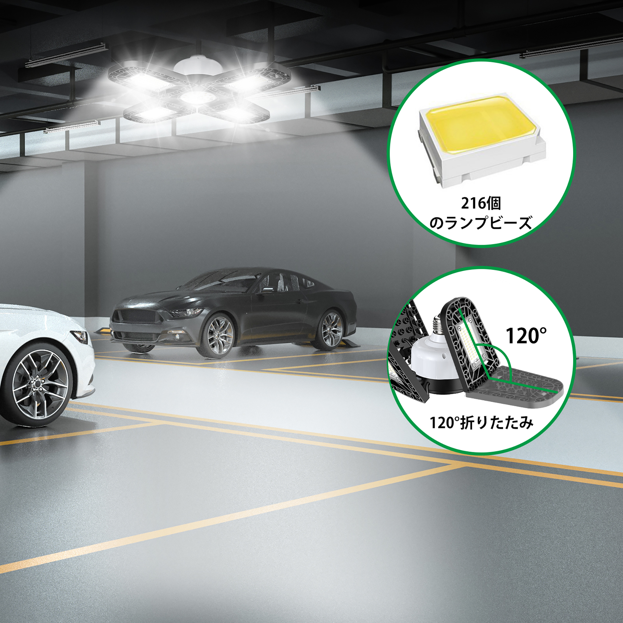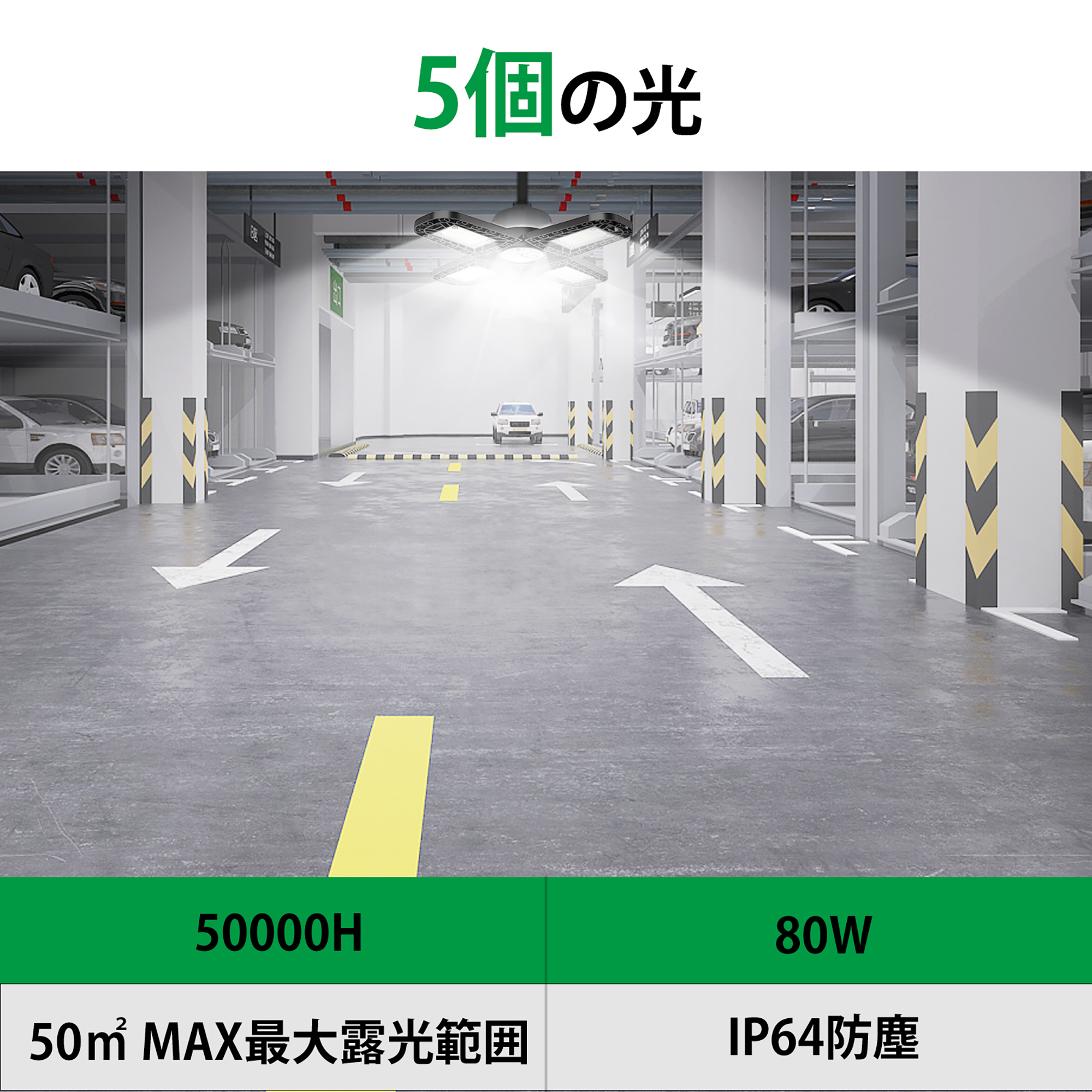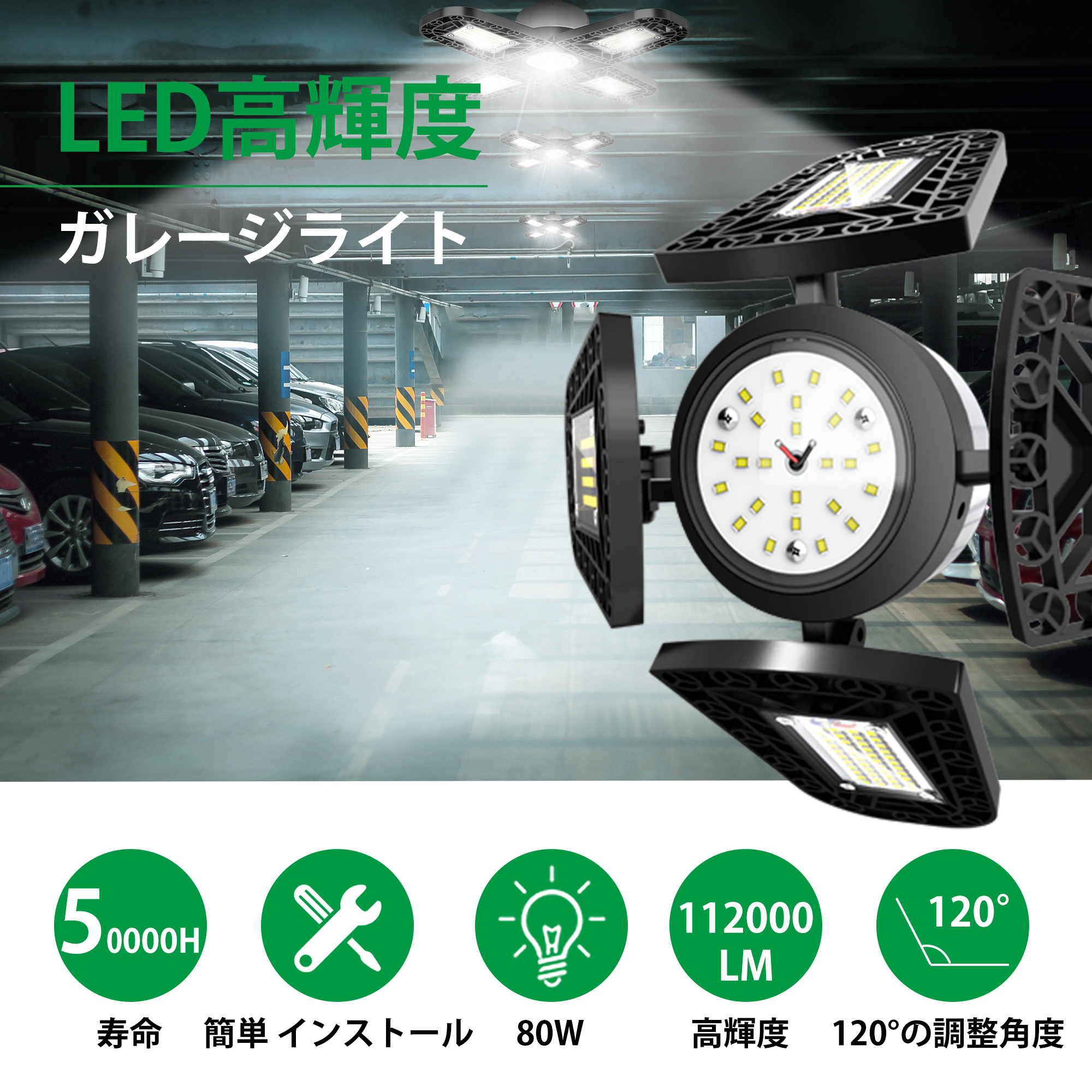 ledライト ガレージライト スーパー 高輝度216ランプビーズ 11200ルーメン 5灯式 80W電力50照射範囲 国際認証安全IP65防塵 アルミニウム放熱 色温度6000k