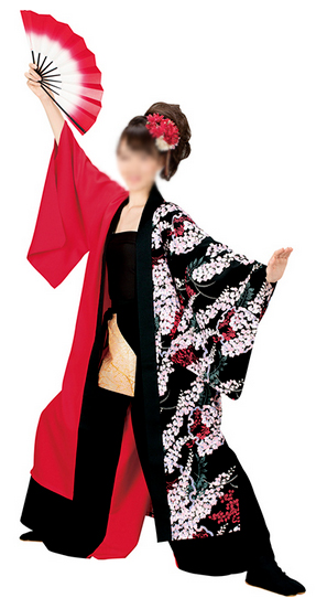 長袢天タイプの、よさこい衣装のサイズ:身丈約120cm・身幅約68cm・袖丈約49cm