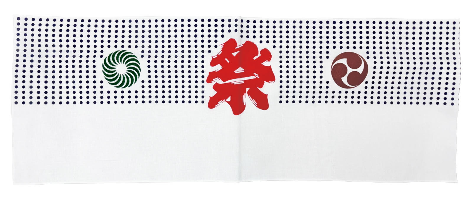 手拭い上半分に紺豆絞り柄+祭・獅子毛・左三つ巴が入った祭手拭です。