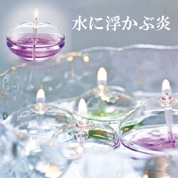 クリアガラス製なので、お好きな色のオイルを入れて楽しめます。水に浮かべて使用するので夏でも涼しげにオイルランプの灯りを楽しめます。
