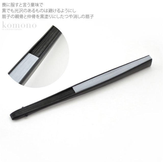 喪に服すと言う意味で黒でも光沢のあるものは避けるようにし扇子の親骨と仲骨を黒塗りにしたつや消しの扇子です。