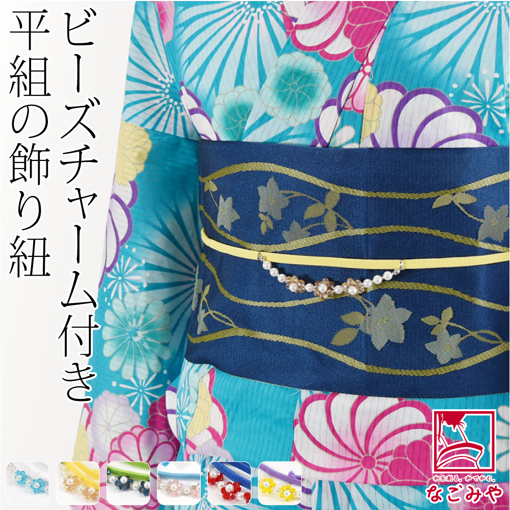 浴衣帯のアクセントになる、ビーズの花飾りがついた平組の飾り紐です。