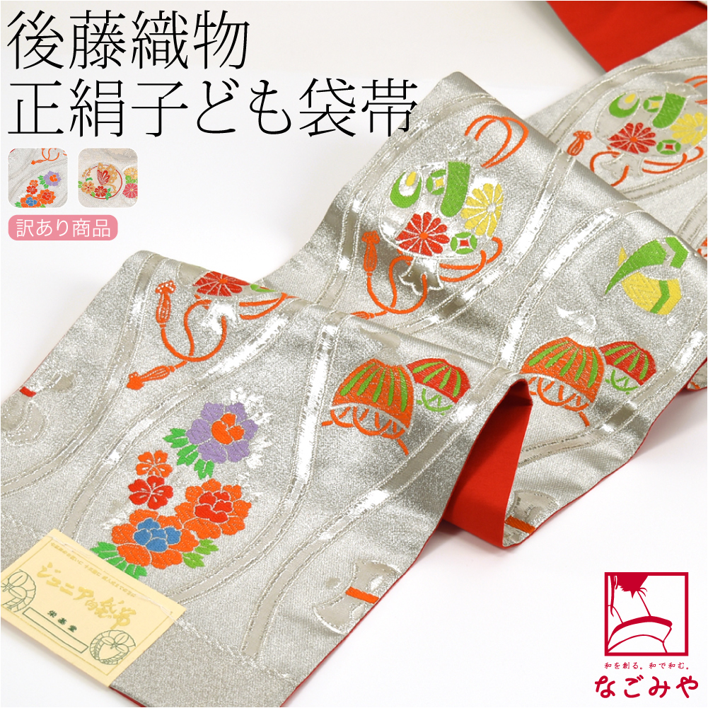 七五三 帯 7歳 袷用 日本製 訳あり 正絹 袋帯 子供用 古典柄 後藤織物 銀系 753 手結び帯 平帯 キッズ
