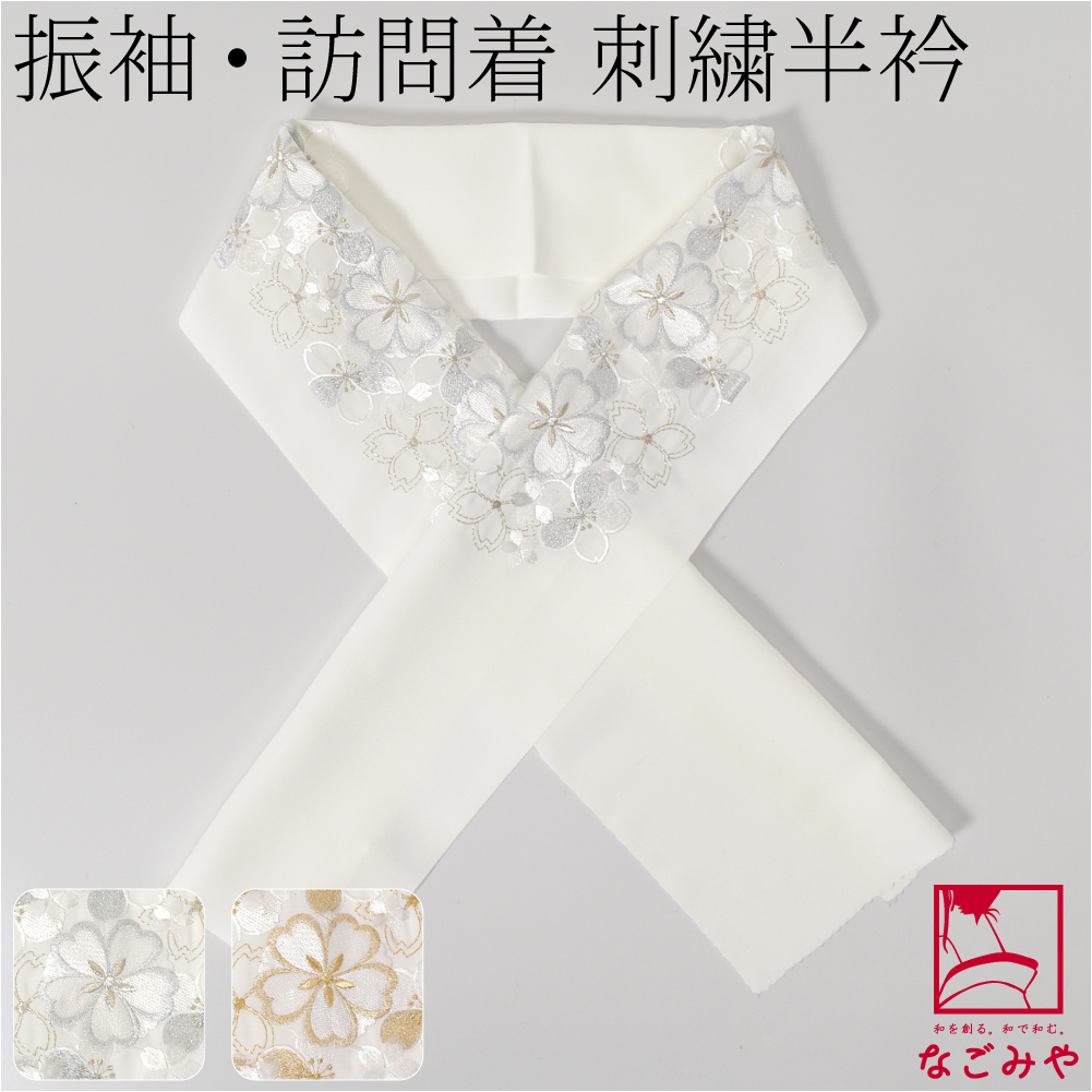 半衿 刺繍 半襟 袷用 日本製 シルエリー 刺繍半衿 白 Cさくら詰め 訪問着 成人式 振袖用 ポリエステル レディース