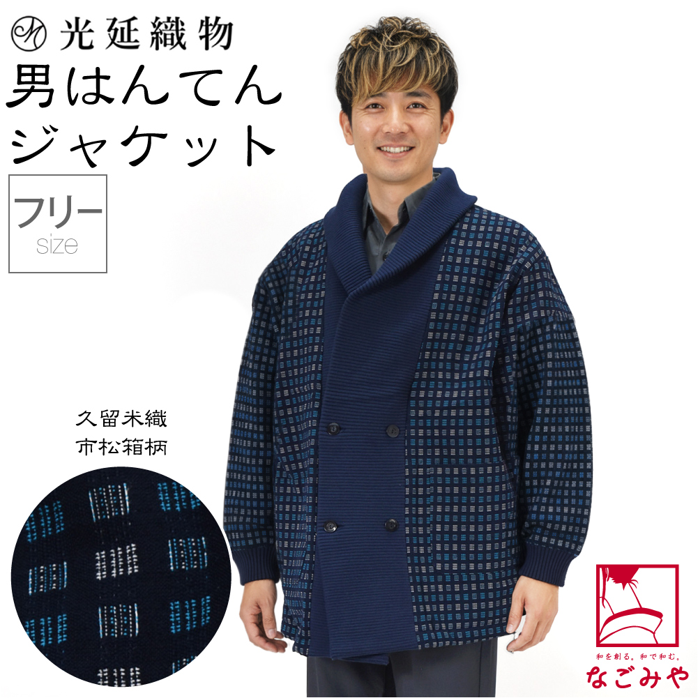 久留米 半纏 メンズ 防寒 冬用 日本製 光延織物 男物 市松箱柄 袢天 衿袖口リブ 高級 綿入れ はんてん どてら 丹前 節電 エコ 部屋着 メンズ
