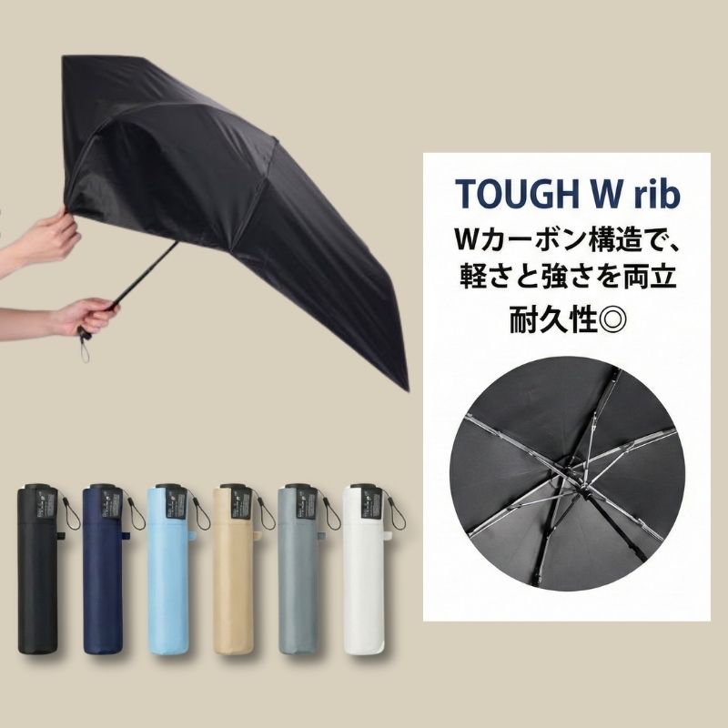 | 【スマホより軽いのに、風に強く雨や日差しからも守る折りたたみ日傘】 雨の日も晴れの日もオールシーズンで使える軽さを追求した晴雨兼用の折りたたみ傘です。 【Tough W rib 55】 カーボン骨を 2 重構造にし、さらに骨の本数を 5 本から 6 本へ増やすことで耐久性を向上。 軽量さを保ちながら、耐風性にも優れたバランスを実現しました。 毎日使う必需品だから「軽さも、UVカットも、涼しさも、デザインも」そんな気持ちに寄り添う為に開発された日傘。 女性の方も男性の方もユニセックでお使いいただけます。 |