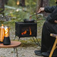 | 小型の薪ストーブは、ソロ少人数の冬キャンプに最適なサイズ感です。 |