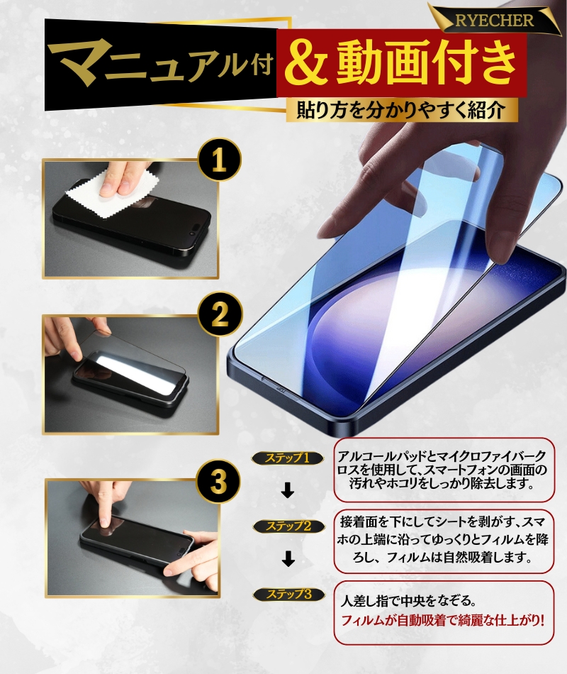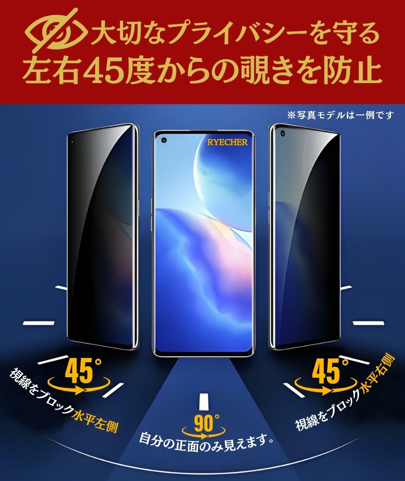 ◎◎◎周りの目をブロック!プライバシーを守る覗き見防止フィルム。ノッチまで守る全面保護タイプは、縁までスクリーンを保護した上、iPhone本体との一体感を高め、美しさを引き出せます。さらにラウンドエッジ加工が施され、スライドしても引っかかり感がなく、裸さながらの質感を実現します。自動吸着タイプで貼り付け時に心配はありません!スマホののぞき見対策は、完全にのぞき見を防ぐものではなく、あくまで「のぞき見されにくくなる」補助的なもの。万が一、情報が漏洩するリスクを考えると、個人情報が表示されるページなどの閲覧は、やはり公共の場では控えたほうが良いだろう。個人情報のセキュリティが問われている今、身を守る方法のひとつとして参考にしてほしい。のぞき見防止フィルムをスマホに貼ると、斜めの角度から画面が見えにくくなる。正面からは正常に見えるため、ユーザー本人には問題なく操作することが可能だ。RYECHER 除き見防止フィルム あなたのプライバシーを守ります。