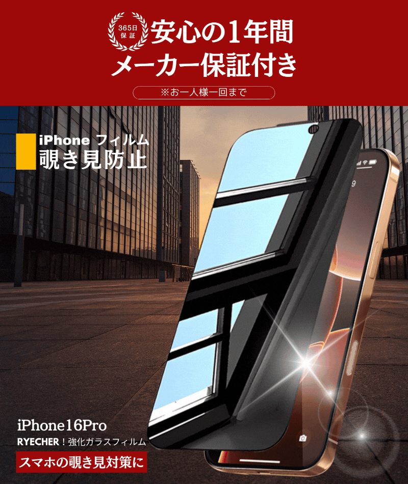 【覗き見防止】 iPhone16Pro ガラスフィルム iPhone16Pro フィルム 覗きみ防止フィルム プライバシー 全面 iPhone16Pro 保護フィルム プライバシー 保護 液晶フィルム 反射防止 除き見防止フィルム 強化ガラス のぞき見 アイフォン16プロ RYECHER 液晶保護フィルム