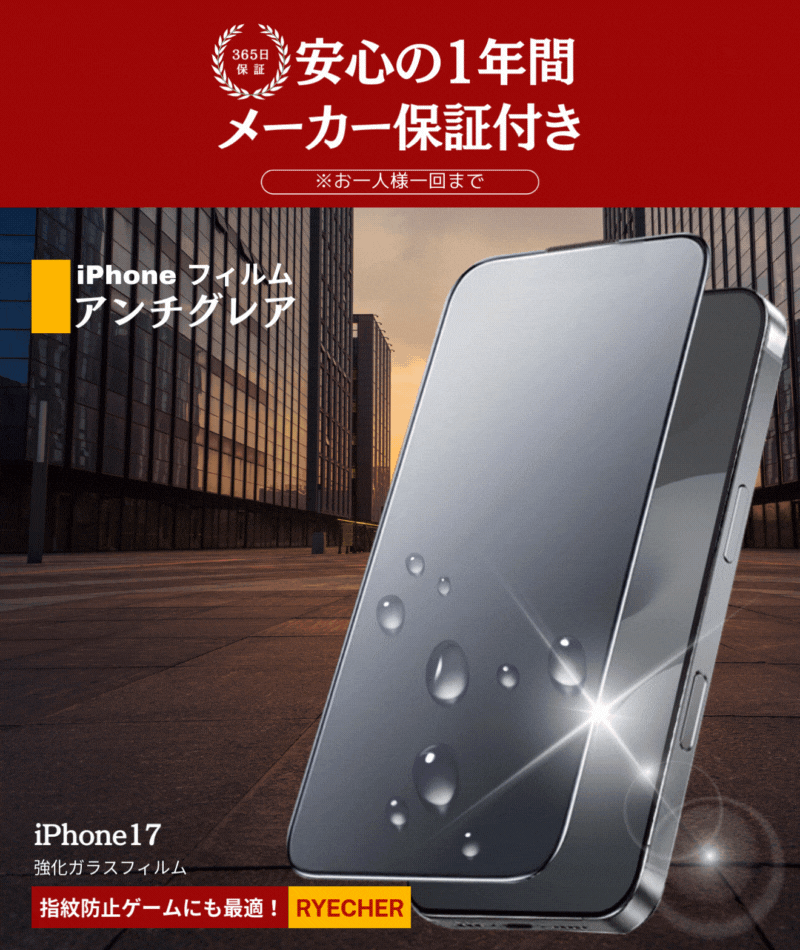 ◎◎◎蛍光灯や太陽光の反射など「ギラギラ感」をなくす反射防止フィルム、指紋がつきにくい指紋ゼロ設計。ノッチまで守る全面保護タイプは、縁までスクリーンを保護した上、iPhone本体との一体感を高め、美しさを引き出せます。さらにラウンドエッジ加工が施され、スライドしても引っかかり感がなく、裸さながらの質感を実現します。自動吸着タイプで貼り付け時に心配はありません!RYECHER iPhone17 ProMax アンチグレア(反射防止)バージョン、ついに登場。