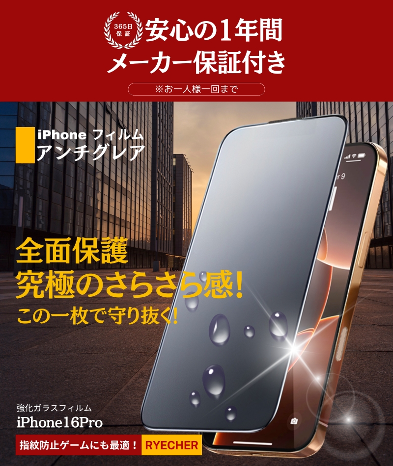 ◎◎◎蛍光灯や太陽光の反射など「ギラギラ感」をなくす反射防止フィルム、指紋がつきにくい指紋ゼロ設計。スクリーン保護フィルムには「失敗しない貼り付け専用ガイド枠」もついております。貼り付け時にずれる心配はありません!RYECHER iPhone16Pro アンチグレア(反射防止)バージョン、ついに登場。