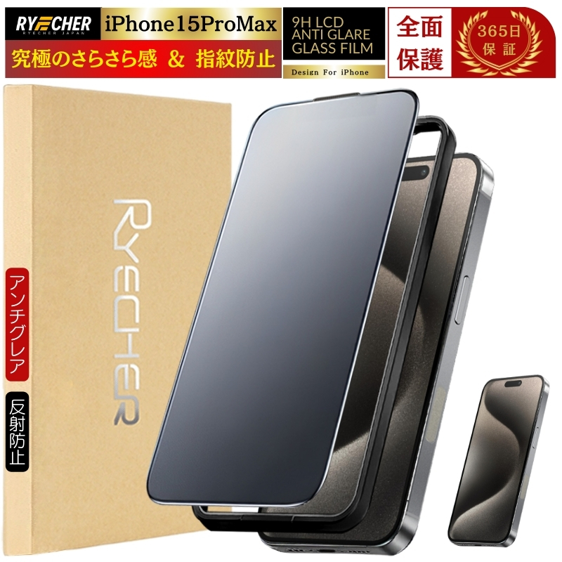 【指紋防止・全面保護・ゲームにも最適】 指紋防止 iPhone15ProMax フィルム アンチグレア マット ガラスフィルム 全面保護 保護フィルム さらさら マット RYECHER アイフォン15プロマックス 液晶保護フィルム