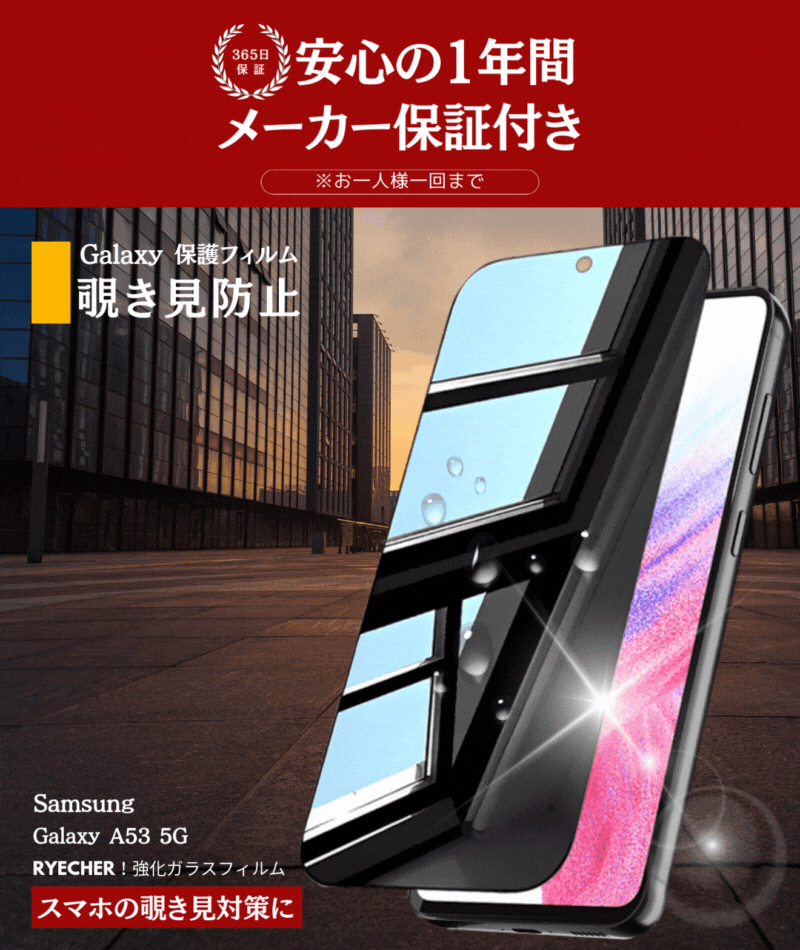 【 覗き見防止 】 Galaxy A53 SC53C 保護フィルム ギャラクシー A53 5G 除き見 SC-53C ガラスフィルム 全面保護 のぞき見 GalaxyA53 5G フィルム 強化ガラス 液晶保護フィルム RYECHER 保護シート サムスン SC53C SCG15 スマホ 液晶フィルム
