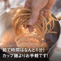茹で時間はなんと1分!お腹が空いた時にパッと、今ある食材で食べられます。噛めば噛むほど玄米の香り、甘みが口に広がってくるので、蕎麦のように喉越しを楽しむというよりは、パスタのように、よく噛んで味わっていただきたい一品です。