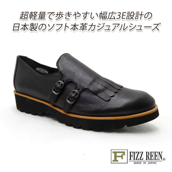 FIZZ REEN 靴 カジュアル スリッポン 軽量 幅広 3E 設計 黒 本革 日本製 フィズリーン 9611 ブラック キルト フラット 履きやすい 送料無料