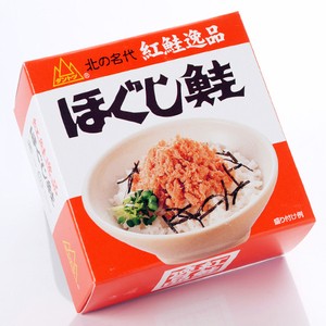 紅鮭を手作業で丁寧にほぐし、北海道の塩で仕上げた、北海道人気の紅鮭フレーク缶詰【商品名】ほぐし鮭