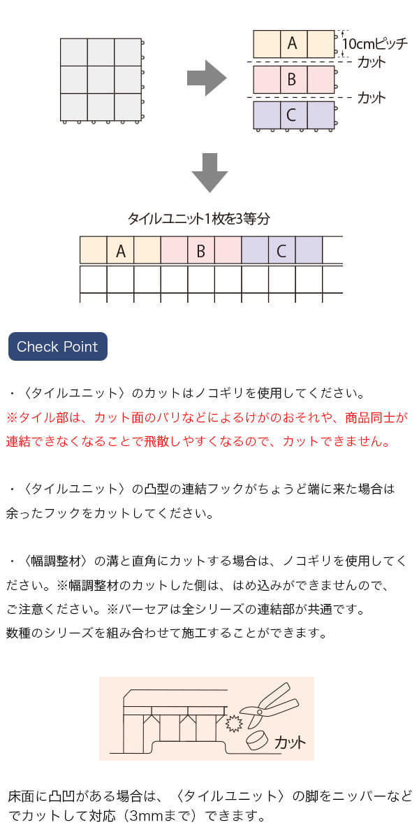 タイルと樹脂がはがれにくい安心の構造です。